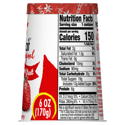 Box contains · 1 cup, 6 oz ; Corn starch, tricalcium phosphate, pectin, carmine . Total fat, 1g / 1% ; Contains 1% or less of: Contains 1% or less of: Contains 1% or less of: Cultured grade a low fat milk, sugar, modified corn starch. Cultured grade a reduced fat milk, sugar, strawberries, modified corn starch, water. Contains 1% or less of: Ingredients cultured grade a reduced fat milk, sugar, strawberries, modified corn starch, water, contains 1% or less of: Cultured grade a reduced fat milk, sugar, strawberries, modified corn starch, water. Saturated fat, 0.5g / 3% ; Cultured grade a reduced fat milk, sugar, strawberries, modified corn starch, water.